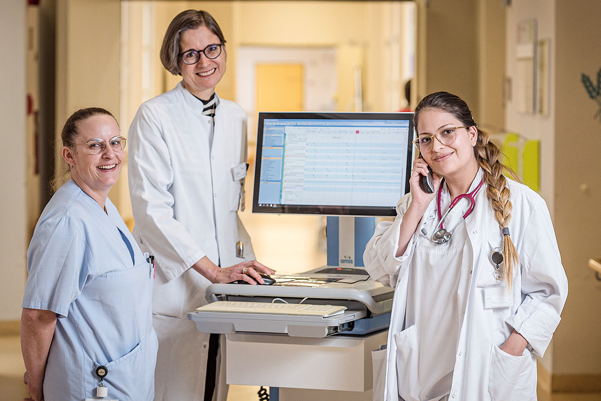 Pflegefachkraft Sarah Firus (v. l.), Chefärztin Prof. Dr. Susanne Petri und Assistenzärztin Laura Valentina Garcia Forero.
